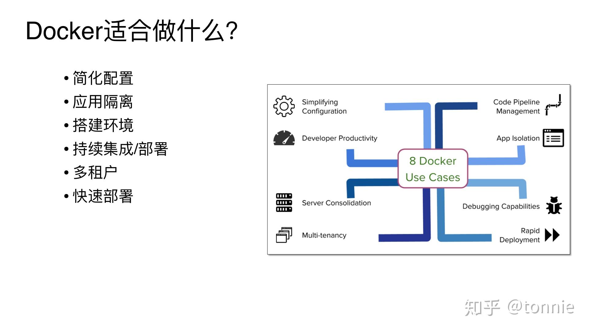 对于开发人员来说,容器技术为应用的部署提供了沙盒环境,开发者可以在独立的容器运行和管理应用程序进程,Docker提供的抽象层使得开发人员之间可以保持开发环境相对的一致,因此Docker适合用于应用隔离,搭建沙箱环境,此外,由于Docker容器的轻量化,它也被适用于进行持续集成和持续部署。