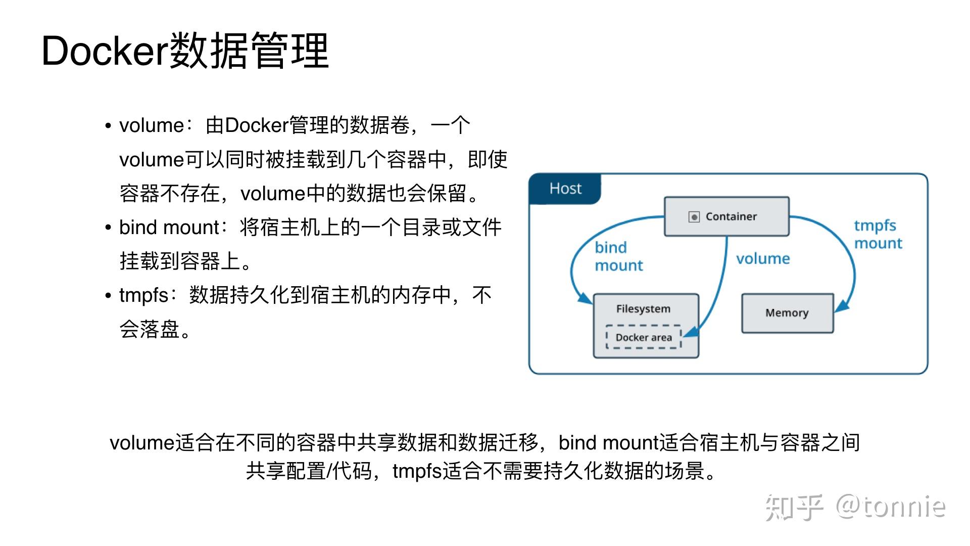 下面介绍一下Docker是怎么管理和存储数据的,Docker提供了3种方法将数据从宿主机挂载到容器:volumes,bind mounts和tmpfs mounts。其中volume适合在不同的容器中共享数据和数据迁移,bind mount适合宿主机与容器之间共享配置和代码,tmpfs适合不需要持久化数据的场景。