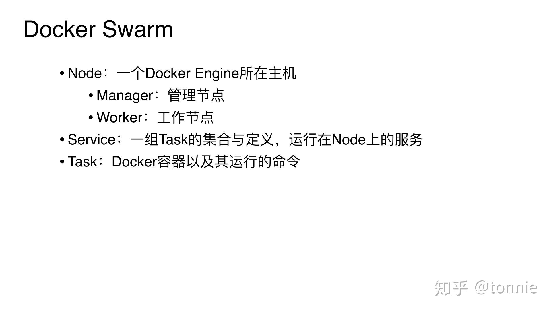 在Swarm中有几个概念,Node代表着Swarm集群中的一个Docker主机,其中每个主机可以是Manager或者Worker两个角色,他们分别代表管理节点和工作节点。Task可以理解为一个Docker容器以及其运行的命令,Service是一组Task的集合与定义,即运行在Node上的服务。