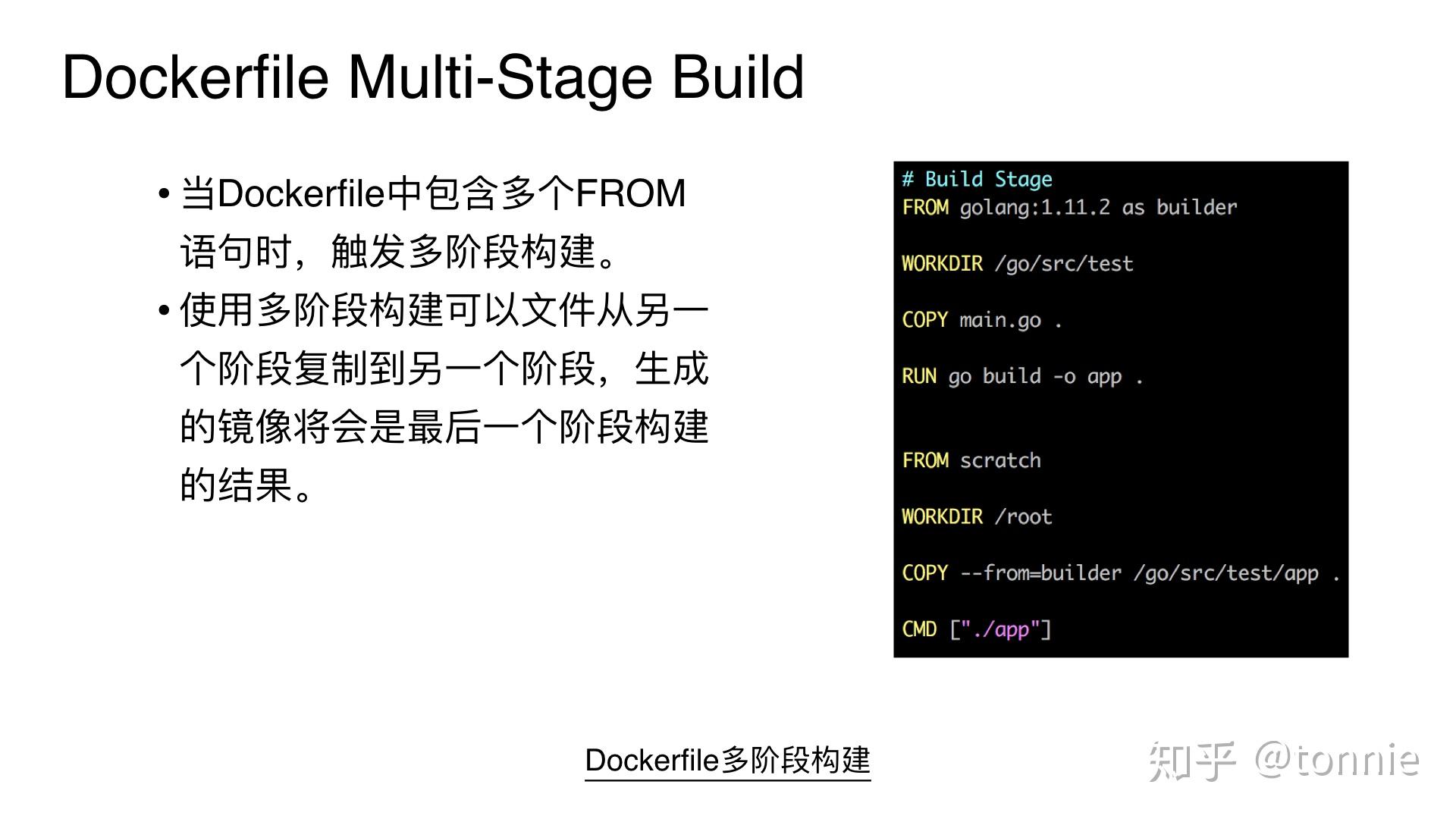 当Dockerfile中包含多个FROM语句时,触发多阶段构建。使用多阶段构建可以文件从另一个阶段复制到另一个阶段,生成的镜像将会是最后一个阶段构建的结果。