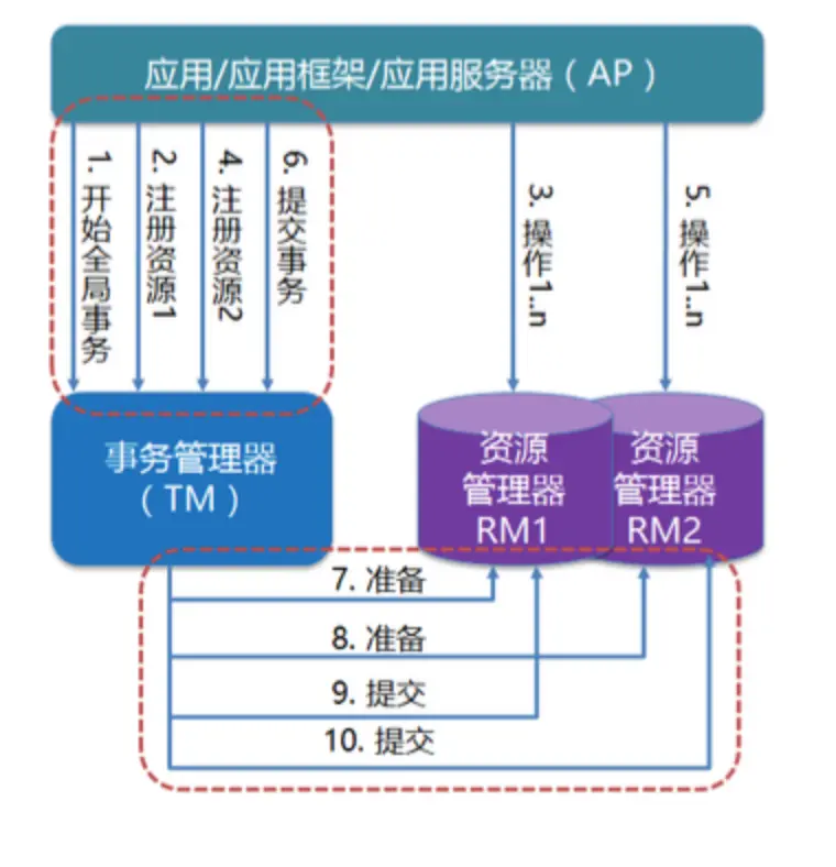 - RM(Resource Manager):资源管理器,可以理解为一个 DBMS 系统,或者消息服务器管理系统,应用程序通过资源管理器对资源进行控制,资源必须实现 XA 定义的接口(比如 Mysql 就实现了对 XA 协议的支持)