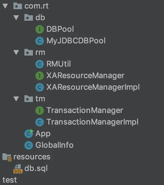 - rm:中存放了资源管理器的实现,主要是针对分支事务的处理与隔离