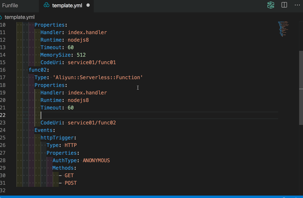 - 模版文件 template.yml 自动补全优化。模版文件 template.yml 提供 MemorySize 可选值自动补全列表。