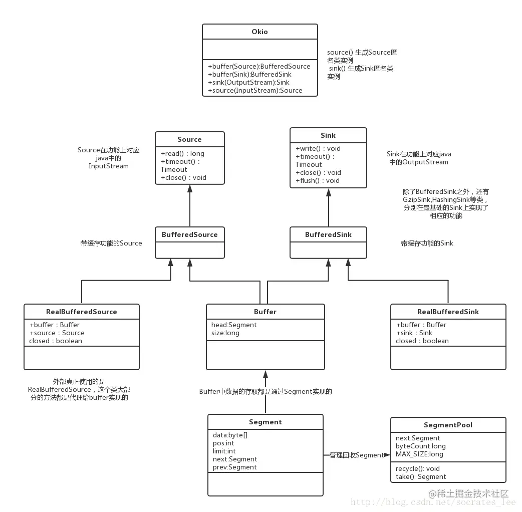 Buffer:BufferedSink和BufferedSource的最终实现实现类, 实现缓存功能,内部有一个Segment链表