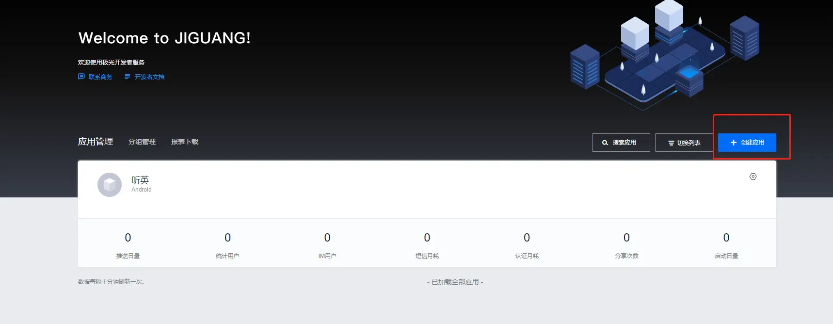 进入开发者平台极光开发者平台 申请账号后创建应用