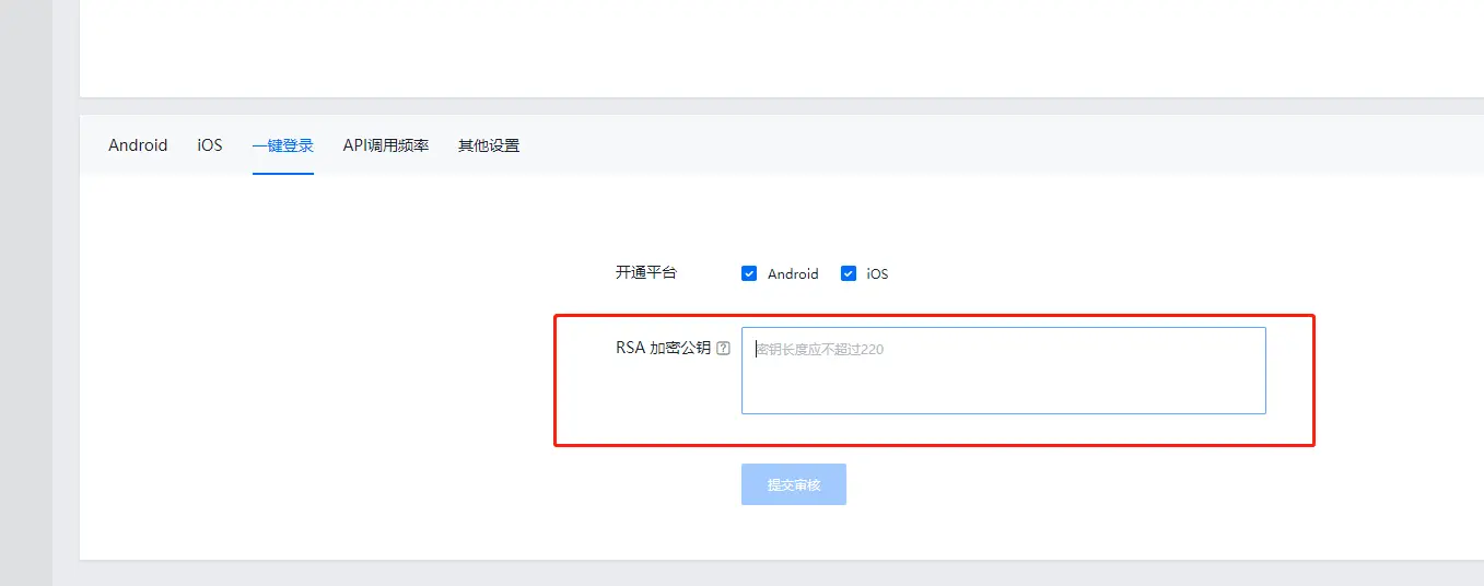 这里忽略了一个细节,在[应用设置] -> [认证设置] -> [一键登陆], 如图,申请RSA加密,把公钥复制上去,之前我们讲了支付宝支付,里面也是一样的逻辑。