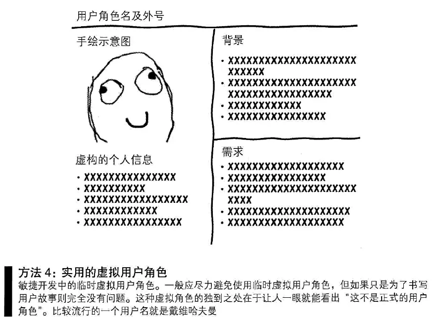 敏捷开发的 UX 项目并不具备制作正式 Persona 的充分数据, 因此, 先基于已知信息来定义用户角色, 之后再对该用户进行拟人化, 生成临时的虚拟角色