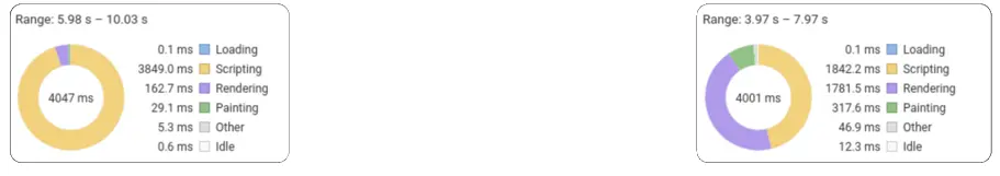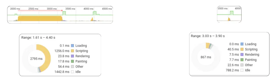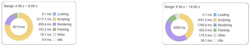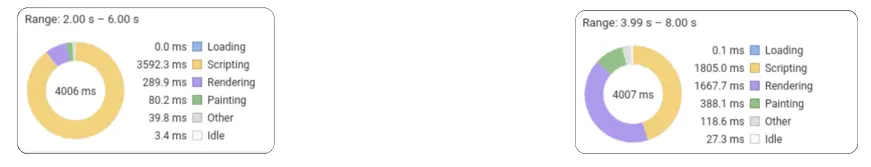 下面是多次重复销毁两个组件性能的对比,黄色的script区域有了一定程度的减少,浏览器就可以做更多的render或者响应。