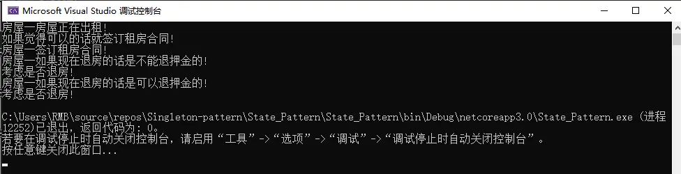 }在上面的代码运行之后房屋一的状态在其对象内部发送了改变,从而行为也发送了变化。刚开始的正在出租改变成了签订合同出租之后。行为变化也从签订合同转变成了退房操作。