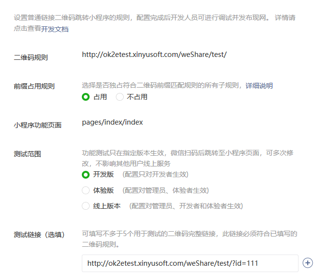- 填写符合二维码前缀匹配规则的二维码完整链接用于测试,如包括参数,请完整填写。
