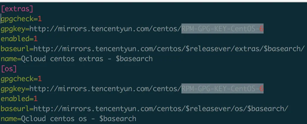 上图节选自腾讯云服务器CentOS-Base.repo,上图中的中括号是源的名字,便于yum取得并识别,下面是配置项,来简单下解释各个配置项的含义。