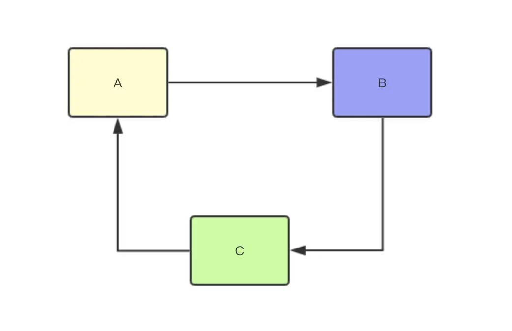 循环依赖,其实就是循环引用,就是两个或者两个以上的 bean 互相引用对方,最终形成一个闭环,如 A 依赖 B,B 依赖 C,C 依赖 A。如下图所示: