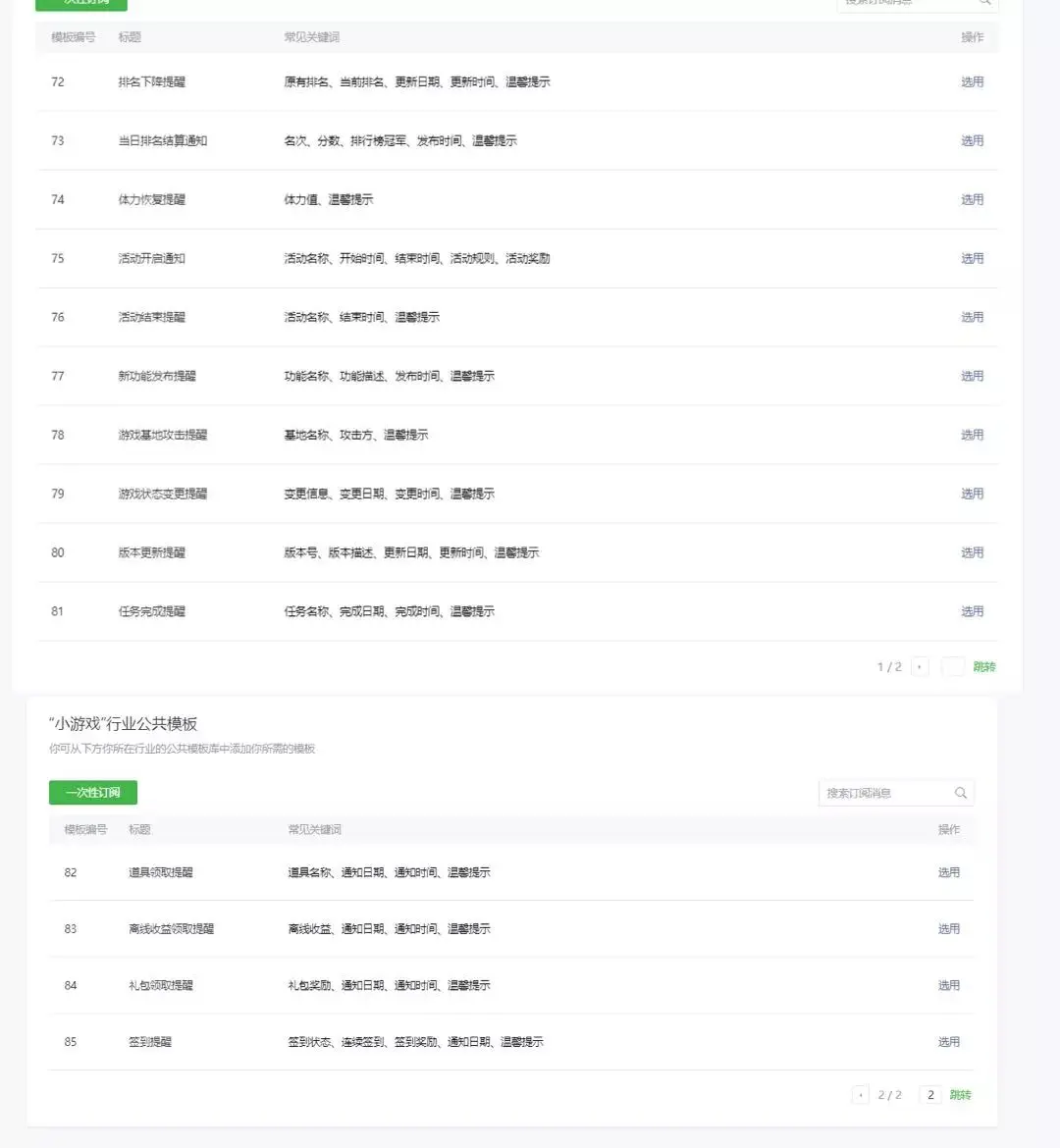 上月底,微信还在小游戏开发者中内测了新的订阅消息能力,虽然和过去一样是一次性订阅,但微信增加了排名下降提醒、当日排名结算通知、体力恢复提醒、活动开启通知等 14 个模板,只有在用户主动点击游戏内某按钮或元素进行订阅的情况下才能推送模板消息。