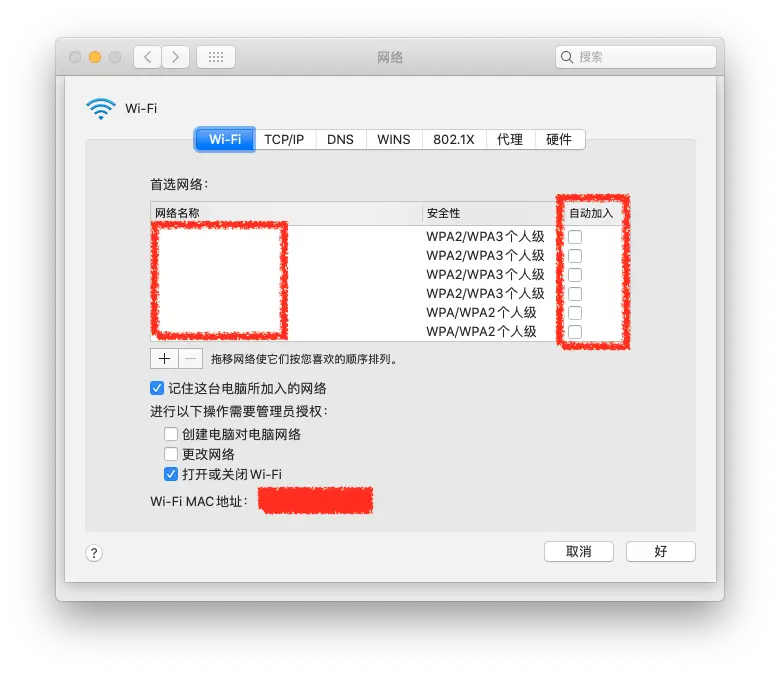 试试在网络偏好设置里的Wifi的高级里把自动加入全部去掉打勾