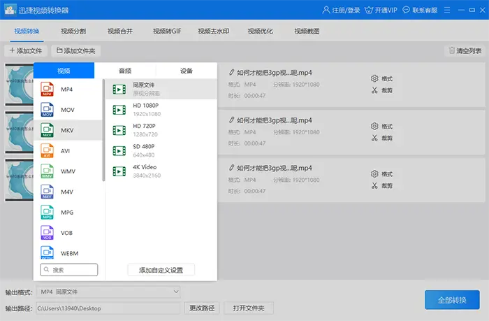 3、然后就是选择转换后文件的格式了。这里软件提供非常多的文件格式使用。但是需要转换成MKV视频格式。而视频的分辨率就可以随便选择了。设置原来视频的分辨率就行了。
