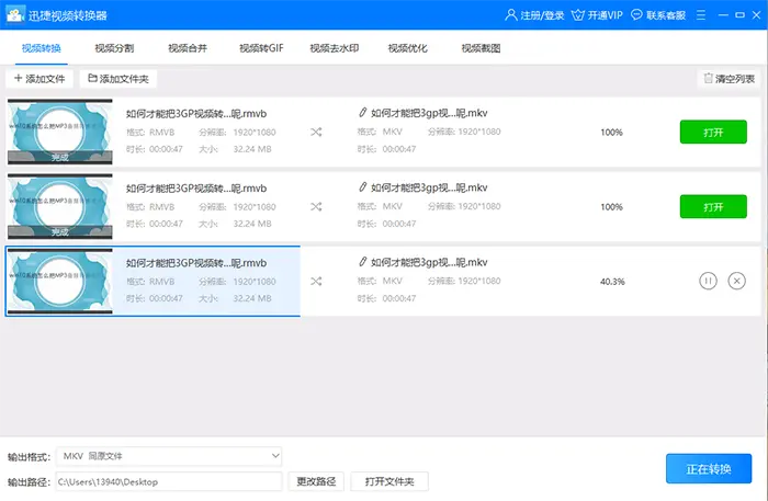 5、最后转换完成之后点击打开按钮然后就可以在保存位置或者桌面上看到转换成功的MKV视频文件了。也可以点击软件下面的打开文件夹按钮打开保存位置的。