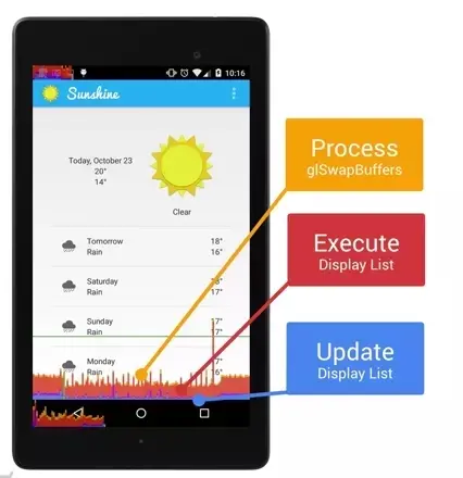 通俗点来讲,黄色代表 CPU 通知 GPU,当 CPU 有太多事情做的时候,黄色的线就会长一些;红色代表渲染时间,比如层次深的情况下,渲染时间就会长一点,红色的线也会长一些;蓝色代表执行 onDraw() 时间。而横着的绿色的那条线代表 16ms 分割线。