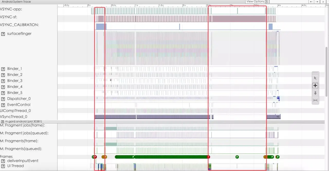 从图片上来看,在加载页面的时候发生过好几次丢帧的情况,可以通过方法开查看具体什么原因导致的丢帧。Frames 是提供的判断绘制该帧的情况,分别有绿、黄和红色,当为空色的时候表示该帧耗时很严重,我们就可以从这些红色的 F 为出发点去分析。