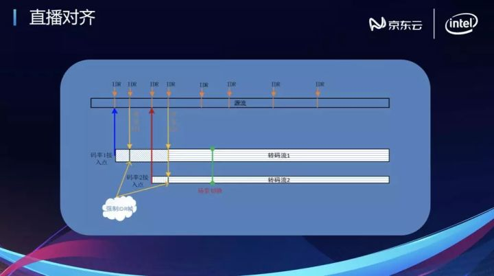 对于直播场景可以借鉴点播的逻辑,但由于不同用户的拉流时间点不同,因此只能在场景切换后的多档直播流做到对齐,不过针对某些场景切换特别长的情况,相应对齐部分也被拉长,直接影响了用户观看体验。京东云在直播对齐中引入了一些同步机制,在拉流过程中将同步信息加入到流中,这一操作并不会对转码效果产生影响,但收到同步信息的每条转码流可以在一个时间点插入I帧对齐,在体验和功能满足性上得到提升。