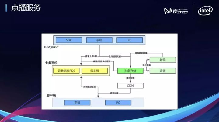 对于点播或者直播服务,高吞吐、低延时的性能、高可用性以及成本优化成为了关键。京东云基于公有云的点播服务中,用户从云主机(业务系统)请求上传链接,这个上传链接对应存储链接,用户直接通过客户端上传数据到对象存储服务,再通过异步处理机制触发业务逻辑(如转码、鉴黄),处理完成后上传到对象存储服务通过异步处理机制触发自有业务系统(如媒资管理等),最后生成链接通过CDN分发。