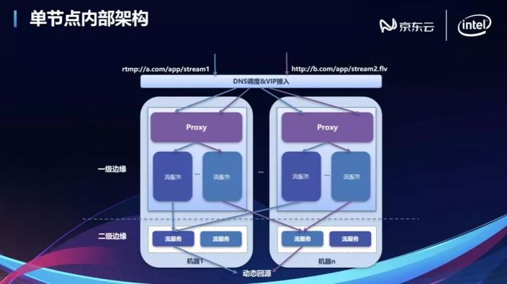 对于一个直播云架构而言,核心诉求集中在高可用、易扩展、高性能三方面,在这一背景下,我们首先需要挖掘单机或单节点的性能潜力。京东云会将每个节点抽象为虚拟的两层,在节点内部的边缘上通过轮询的方式将流量打散接入,如果出现突发流量可以充分利用每个机器的能力,在流量打散后内部通过哈希汇聚到内部逻辑的二级源,再由二级源做真正的回源。当有多路流时可以合并回源,减小回源带宽,同时有效减少它们内部的交互成本。