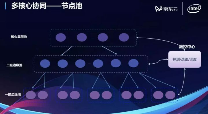 伴随京东云核心集群和边缘节点的不断建设扩充,京东云通过流控中心实时探测网络情况,对回源线路进行统一调度,实现二级源之间回源、二级源和其他核心集群回源等多种动态调度备线方案。当其中一个节点出现网络抖动或故障时,其他节点可以即时从备选线路回源。至此,各层级集群发展为“节点池”的概念,也就是不再依赖人工运维状态下的以地域划分集群,而是形成核心集群池、二级边缘池和一级边缘池,分发回源和推流回源通过流控中心实时探测生成最优线路及多条备线。特别一提的是,普通CDN是通过IDC到IDC进行网络质量探测,而京东云基于京东商城配送站资源,将其模拟为一个端探测CDN边缘节点质量,提升边缘节点到用户的最后一公里质量。