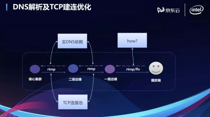 我们知道直播云质量评价核心指标包括首开时间、卡顿率、内容延迟和可用性,上面所讲架构演进更多是围绕可用性提升展开,京东云在首开时间和卡顿率方面也做了很多优化工作。首开时间的消耗主要在DNS解析、TCP建连、应用层握手及协商、数据发送等几方面。要加速首开,最简单可以想到的就是通过主动预热把流提前拉到边缘节点:视频数据距离用户越近首开时间一定就快。但对于直播长尾效应而言,预热这种手段对CDN来说无疑具有非常巨大的成本压力,常态服务时无法使用。长尾效应下存在大量的直播冷起播放,针对冷起情况下的首开优化就尤为重要。在内部交互(一级边缘到核心集群)中我们通过“去DNS依赖”和维护“长连接的TCP连接池”的方式消除DNS解析和TCP建连的时间消耗,而一级边缘到用户端可以通过在Client端进行“DNS预解析”节省DNS解析时间(这部分需要Client进行优化)。于此同时,针对应用层握手及协商过程,京东云放弃了原生的RTMP协议(需要5-7个RTT),内部使用私有KTMP协议(playload兼容RTMP),在1个RTT完成握手及协商,这样极大的降低了握手及协商过程的交互开销。