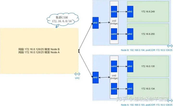 集群控制器有了这个参数,在节点 kubelet 注册节点到集群的时候,集群控制器会为每个注册节点,划分一个子网出来,即为每个节点分配 podCIDR。如上图,Node B 的子网是 172.16.8.1/25,而 Node A 的子网是 172.16.0.128/25。这个配置会记录到集群 node 的 podCIDR 数据项里。
