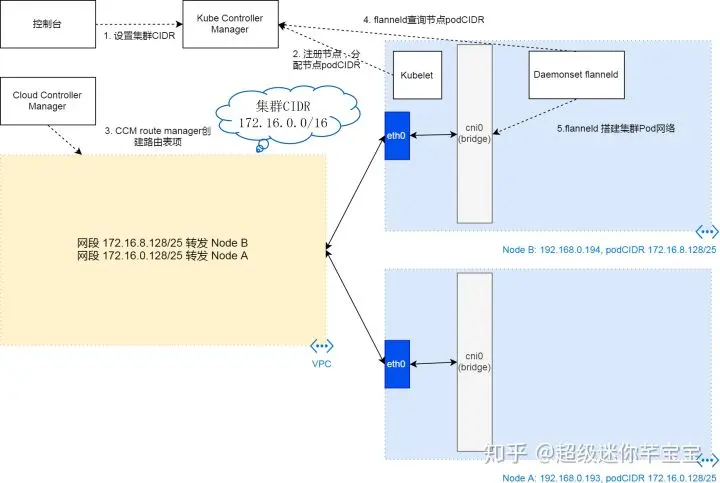 - 第一个是集群通过 Cloud Controller Manager 给 VPC 配置路由表项。路由表项对每个节点有一条,每一条的意思是,如果 VPC 路由收到的目的地址是某一个节点 podCIDR 的 IP 地址,那么路由会把这个网络包转发到对应的 ECS 上;