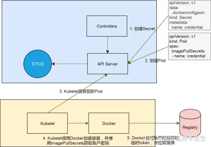 - Kubelet 作为集群控制器,监控着集群的变化。当它发现新的 pod 被创建,就会通过 API Server 获取 pod 的定义,这包括 imagePullSecrets 引用的 secret;