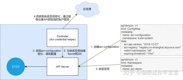 具体来说,控制器会监听 acr-configuration 这个 configmap 的变化,其主要关心 acr-registry 和 watch-namespace 这两个配置。前一个配置指定为临时账户授权的镜像仓库地址,后一个配置管理可以自动拉取镜像的命名空间。当控制器发现有命名空间需要被配置却没有被配置的时候,它会通过阿里云容器镜像服务的 API,来获取临时账户和密码。