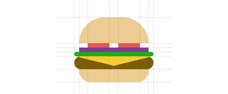 }现在,我们得到了”汉堡“中所有元素的大致位置,接下来继续完善这些元素的细节,比如颜色,面包的圆角等。而且可以在牛排上放置一个倒三角,以实现完整的芝士效果。