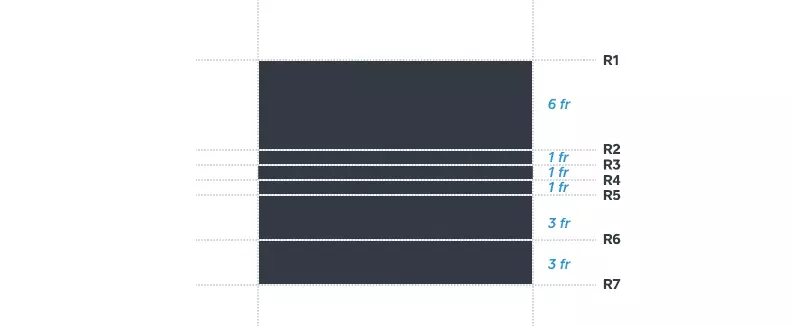 grid-template-columns:[C1] 1fr [C2] 2fr [C3] 5fr [C4] 2fr [C5] 5fr [C6] 2fr [C7] 1fr;接下来,我们使用 gird-column 来定义每一层元素在x方向(横向)上所占据的空间。