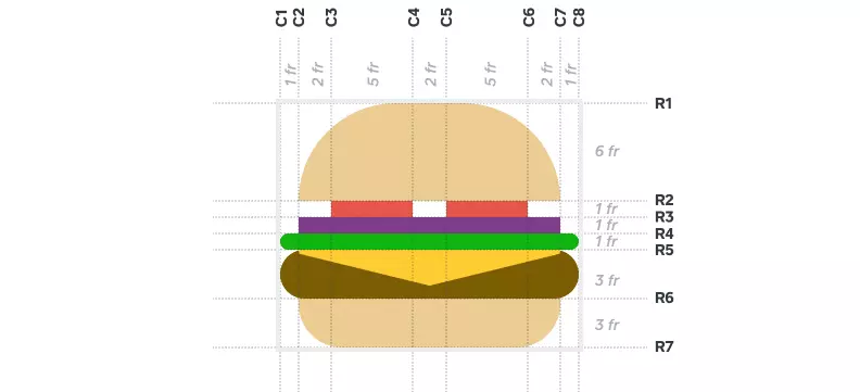 现在我们设想一个网格里的x轴(列)和y轴(行),y方向(行)可以决定这个表格中到底叠放多少层元素以及每层元素的高度。一个汉堡,底层是面包,中间层:牛肉、生菜、洋葱、西红柿,顶层是面包,那么我们就需要6行。