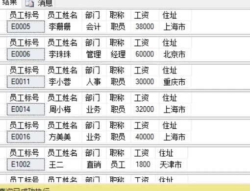 select @emp_no 员工标号,@emp_name 员工姓名,@dept 部门,@title 职称,@salary 工资,@addr 住址