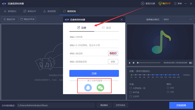 第一步:首先我们需要打开电脑上安装的迅捷音频转换器,打开之后点击“注册/登录”用手机号注册登录或者直接用微信、QQ快捷登录。软件登录之后,再开始后面的操作。