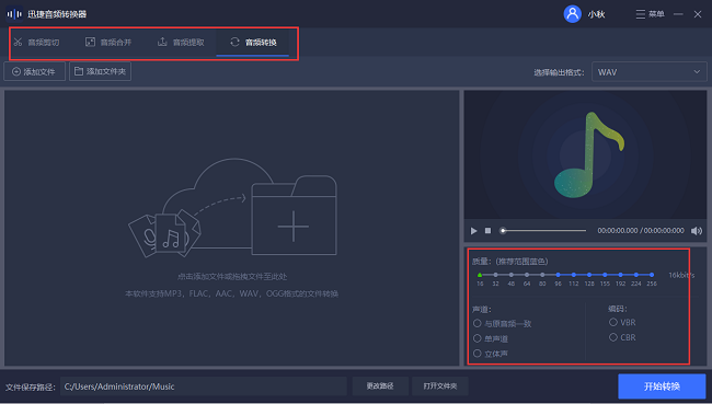 第二步:之后,先大概了解下界面里功能参数,这里我们可以看到有“音频剪切”、“音频合并”、“音频提取”、“音频转换”四个主要功能。界面右方还能自定义设置音频的参数:声道、质量以及编码。