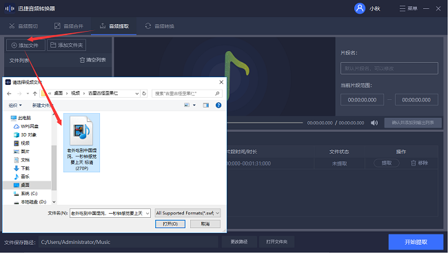 第三步:这里我们需要提取视频音频,那么可以选择进入“音频提取”界面,然后点击“添加文件”这时会有一个小窗口弹出,选择需要提取的视频片段导入即可。