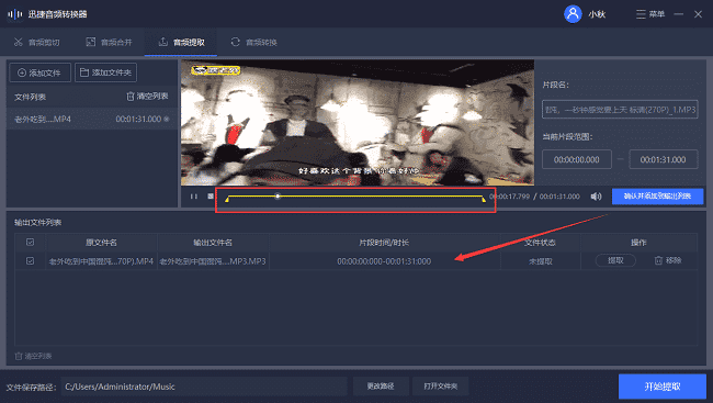 第四步:接着界面会出现你刚刚所导入的视频片段,你可以随意两边的进度条来调节你所需要截取的音频片段,选好后点击“确认并添加到输出列表”。提示:可以多次选择音频片段截取,只要选好后像上面一样点击确认操作就好了。