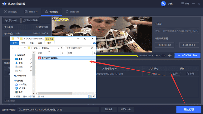第六步:以上设置全部完成后,最后就是点击右下角的“开始提取”按钮,稍等两分钟即可成功提取。然后会显示“打开”,这个时候点击“打开”就可以在选择的保存地点看到成功提取的音频片段。方法就是这么简单!