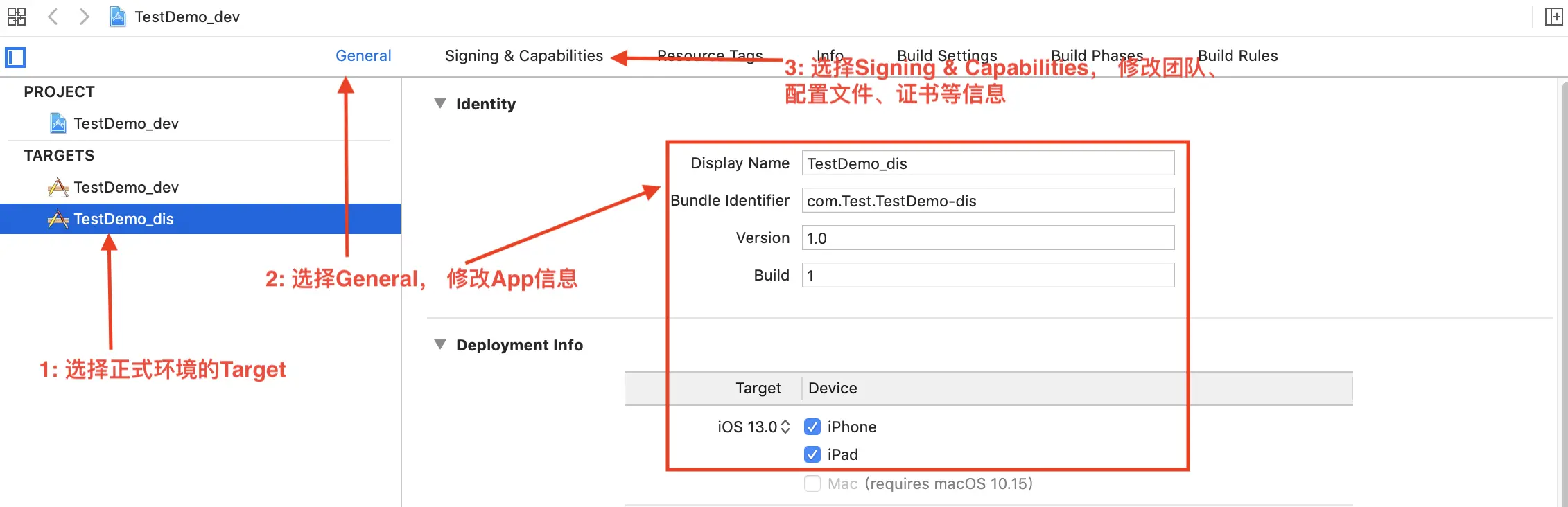 (1)更改测试环境下的General 和 Signing & Capabilities 中的信息