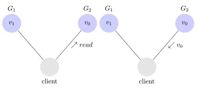 问题是,用户有可能向 G2 发起读操作,由于 G2 的值没有发生变化,因此返回的是 v0。G1 和 G2 读操作的结果不一致,这就不满足一致性了。