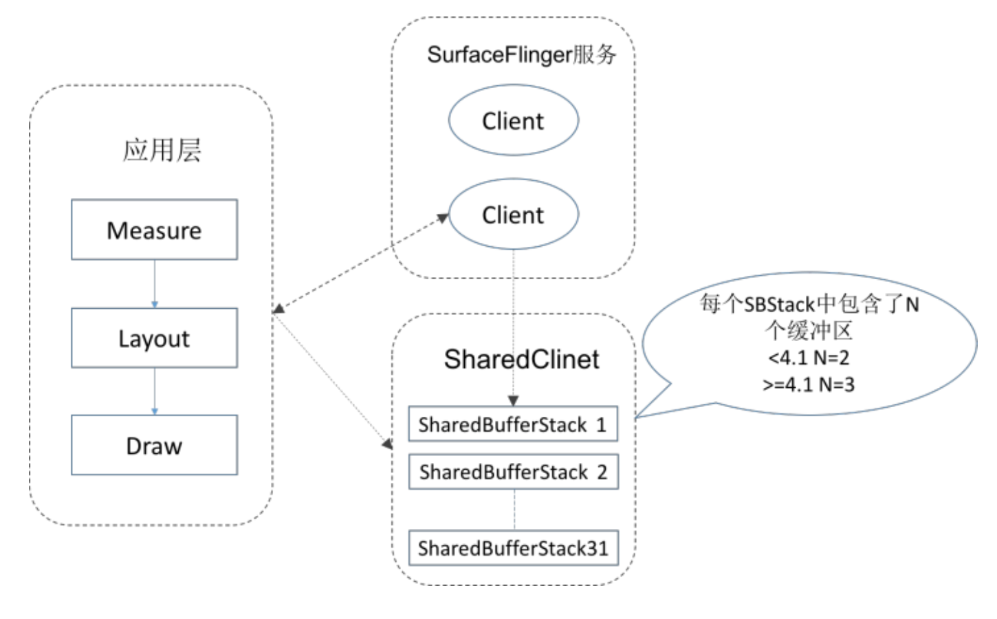 Android4.1版本后还加入了三级缓冲机制Triple Buffering.在之前系统使用的是双缓冲机制,双缓冲机制简单说就是不同的View或者Activity它们都会共用一个Window, 也就是共用同一个Surface对象. 而每个Surface都会有一个BufferQueue缓存队列,但是这个队列会由SurfaceFlinger管理,通过匿名共享内存机制与App应用 层交互.