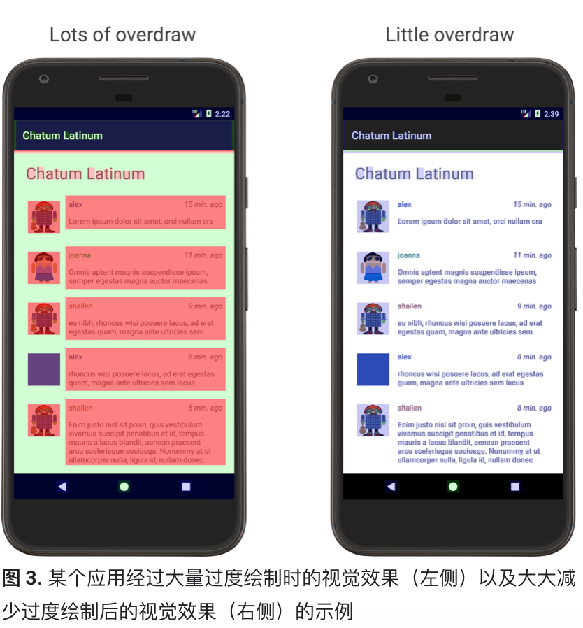 在Android 4.2,系统增加了检测绘制过度工具,具体的使用方法可以参考《检查GPU渲染速度和绘制过度》