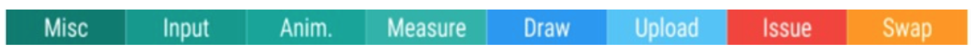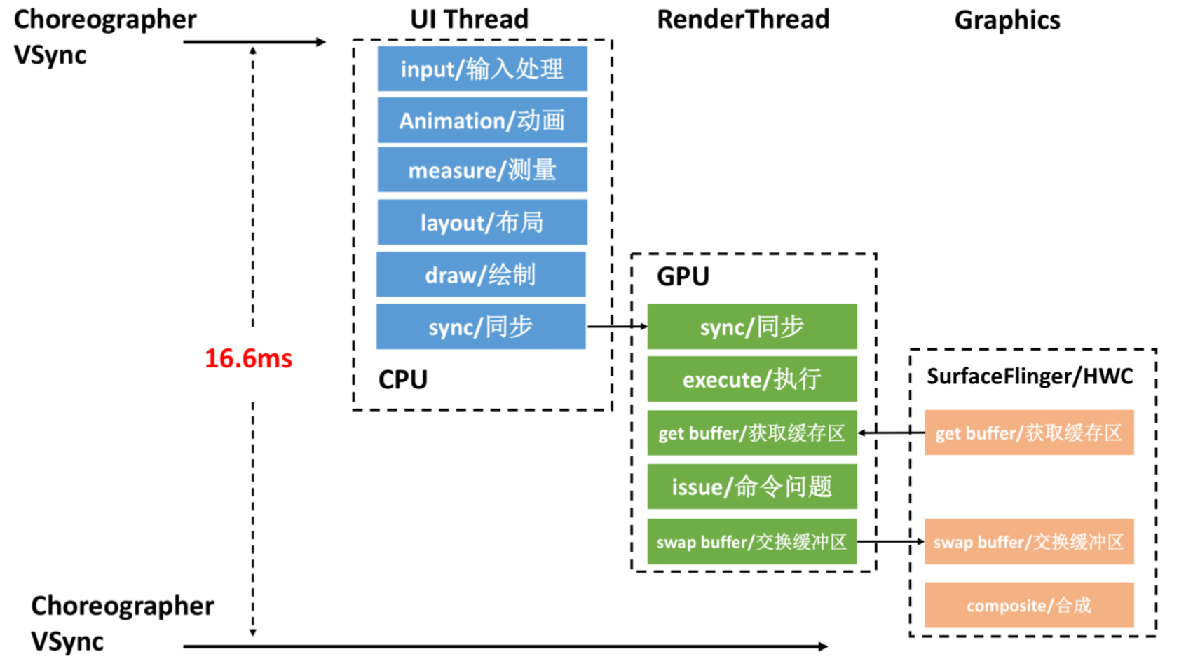 UI主线程“既当爹又当妈”,任务过于繁重.如果整个渲染过程比较耗时,可能造成无法响应用户的操作,进而出现卡顿.GPU 对图形的绘制渲染能力更胜一筹,如果使用GPU并在不同线程绘制渲染图形,那么整个流程会更加顺畅. 正因如此,在Android 5.0引入了两个比较大的改变.一个是引入了RenderNode的概念,它对DisplayList及一些View显示属性 做了进一步封装.另一个是引入了RenderThread,所有的GL命令执行都放到这个线程上,渲染线程在RenderNode中存有渲 染帧的所有信息,可以做一些属性动画,这样即便主线程有耗时操作的时候也可以保证动画流畅. 在官方文档 《检查GPU渲染速度和绘制过度》中,我们还可以开启Profile GPU Rendering检查.在Android 6.0之后,会输 出下面的计算和绘制每个阶段的耗时: