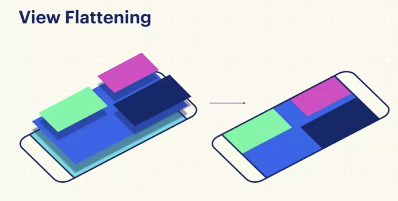 前面也提过降低布局层级是一个非常通用的优化方法.有没一种方法不通过代 码的改变可以直接降低UI的层级呢?Litho就给了我们一种方案,由于Litho使用了自有的布局引擎(Yoga),在布局阶段就可以检测不必要的层级、减 少ViewGroups,来实现UI扁平化.比如下面这样图,上半部分是我们一般编写这个界面的方法,下半部分是Litho编写的界 面,可以看到只有一层层级.