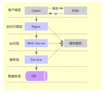 (1)客户端层:手机或PC端操作的客户端页面,域名通过DNS解析路由到Nginx