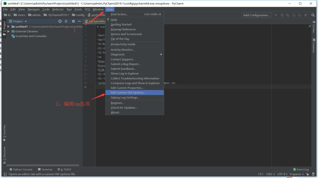 进入到项目界面后,点击Pycharm最上面的菜单栏中的 “Help” -> “Edit Custom VM Options …”,如果提示是否要创建文件,请点”Yes”。