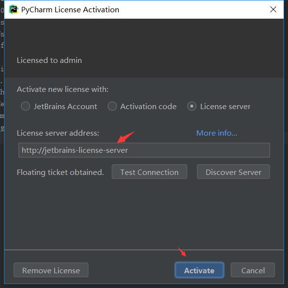 修改完配置文件之后重启pycharm,点击菜单栏中的 “Help” -> “Register …”,选择最后一种License server激活方式,地址填入:http://jetbrains-license-server (应该会自动填上),或者点击按钮:”Discover Server”来自动填充地址,完成激活