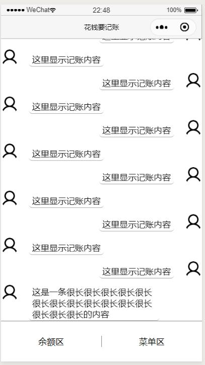 .billItems中的flex-direction: column是让scroll-view中的内容按纵向一个一个添加;.avatar中设定了宽高并定义border-radius: 50%是为了用一个正圆展示头像;.content设置了max-width: 61.8%是限制展示内容的最大宽度,word-wrap: break-word保证了超过最大宽度时内容会自动换行,border-bottom: 1px solid rgba(0, 0, 0, 0.4)和border-radius: 6px用来显示一个带弯角的底部边框,像个托盘一样,运行一下看看效果